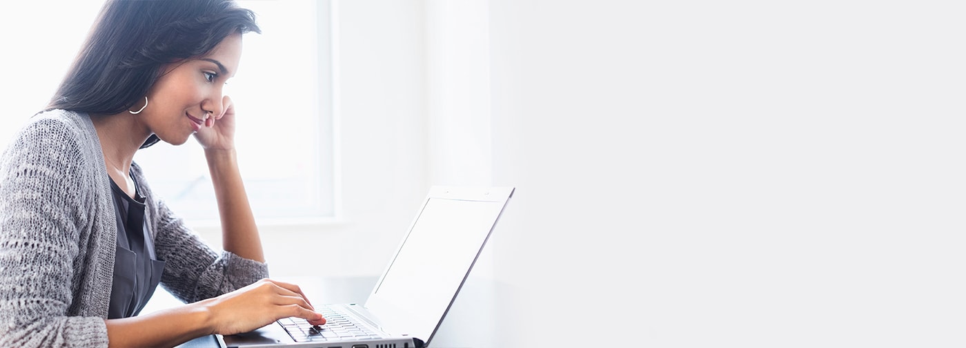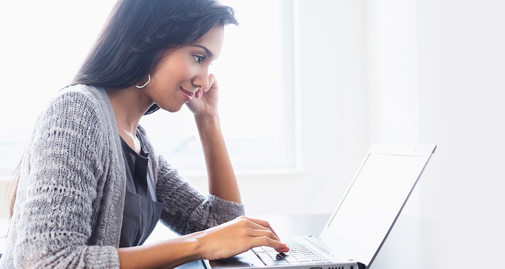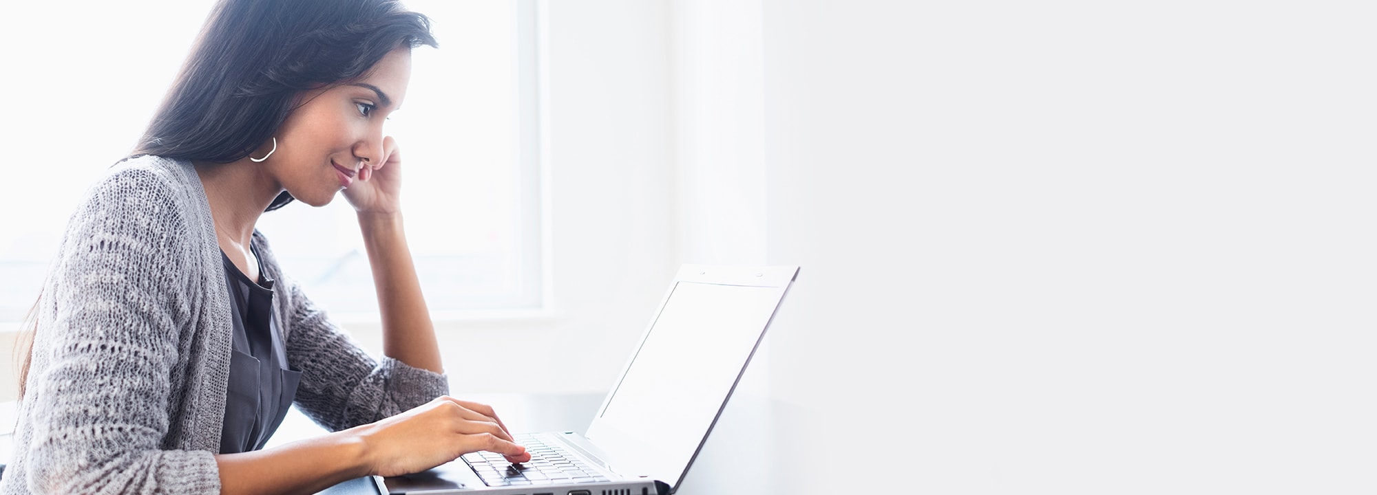 Woman looking at laptop by a window