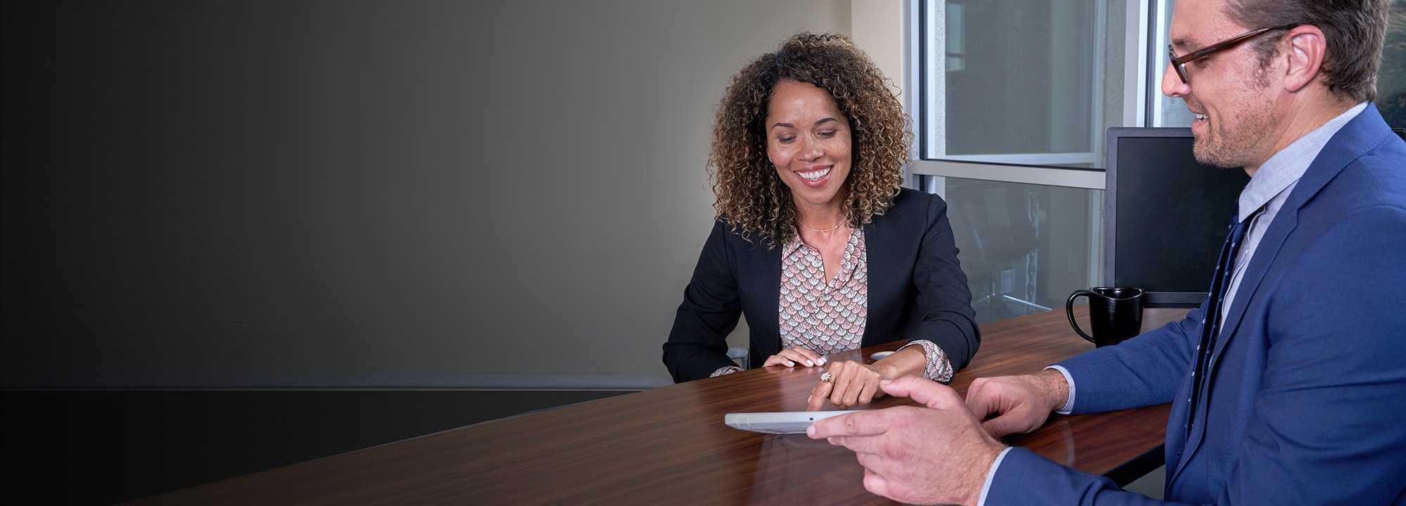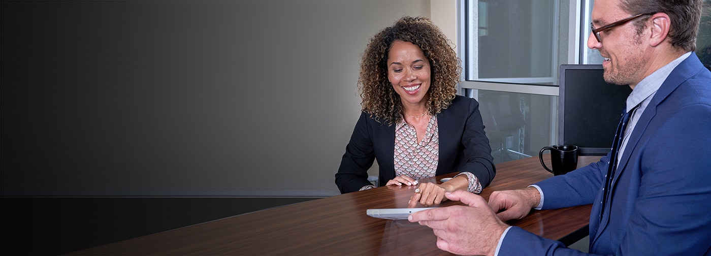 Man and woman looking at papers on a desk in an office