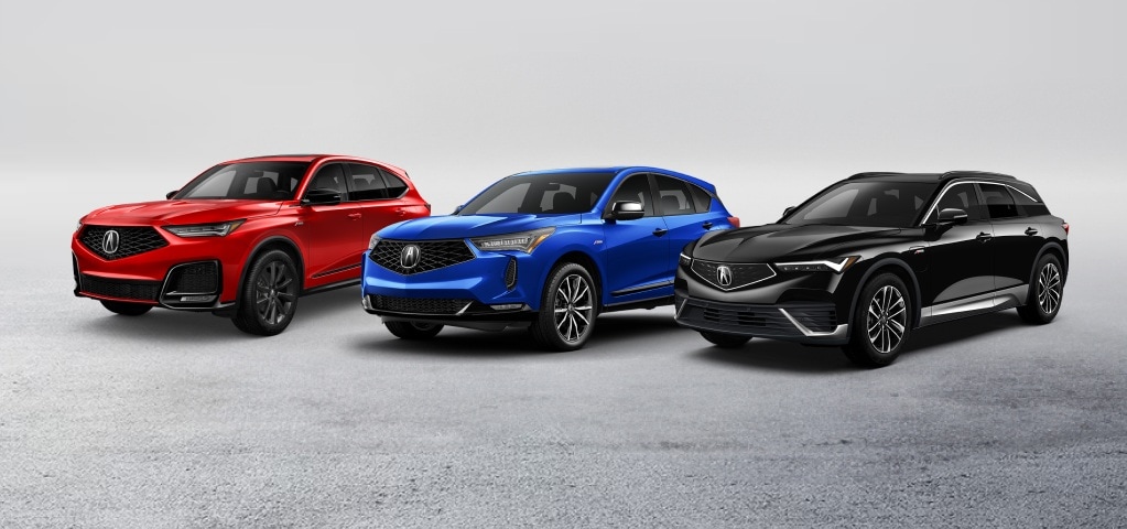 3/4 front view Acura MDX A-Spec in Performance Red Pearl and RDX A-Spec in Apex Blue Pearl and ZDX in Cosmic Black Metallic